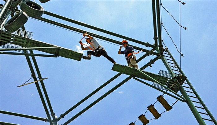 這是一個個人自我挑戰的項目。每位隊員都要在安全保護情況下,爬上斷橋,從斷橋的一側跳到另一側, 然後再跳回來,最後安全下來。 通過這個項目,學員能體驗高空項目的挑戰和戰勝自我的成就感;提高在危機情況下,自我控製和目標管理的能力;培養隊員間互幫互助的同理心。